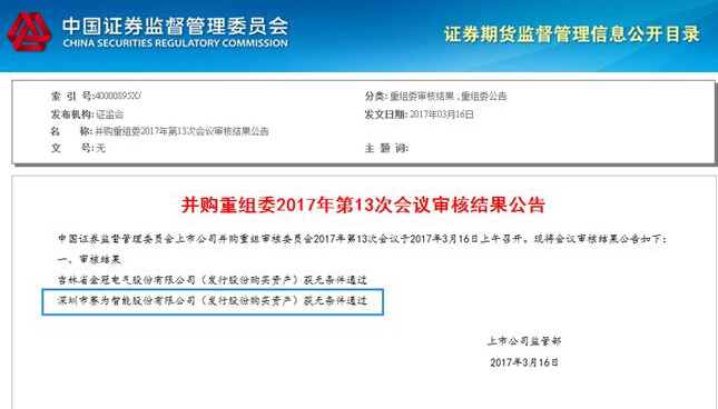 3月16日晚,证监会发布公告,证监会并购重组委第13次会议于3月16日上午召开,根据审核结果,ledong.com智能(300044)发行股份购买资产获无条件通过。