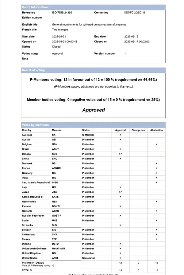 系留无人机系统作为无人机领域的重要分支,具有长时间的滞空悬停能力和数据传输带宽大的优势,已在公共安防、应急通信、抢险救灾等行业领域发挥巨大作用。制定系留无人机系统通用要求标准,在国际上形成统一共识,是规范技术发展,开展行业管理的重要基础,可切实指导系留无人机系统及部件的设计、制造与试验验证,为系留无人机系统发展奠定扎实的技术基础。